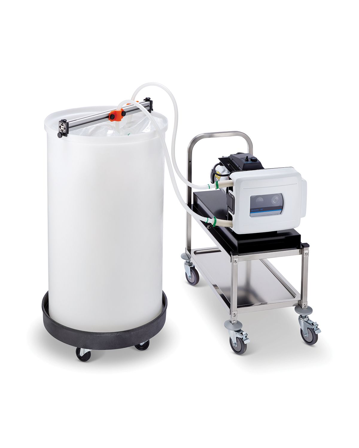 The system works by using a disposable mixing nozzle to direct recirculation fluids and powders throughout the single-use bag. The bag is fitted inside a reusable rigid outer container. Using the mixing nozzle design, multiple tubing sizes and the conical-shaped container, the mixing system creates either a gentle or robust turbulent mixing that sweeps and lifts the contents from the bottom of the bag. The recirculation action is accomplished using an external peristaltic pump which helps minimize capital expenses. If the system needs to be mobile a tank dolly and cart for the pump can be utilized.